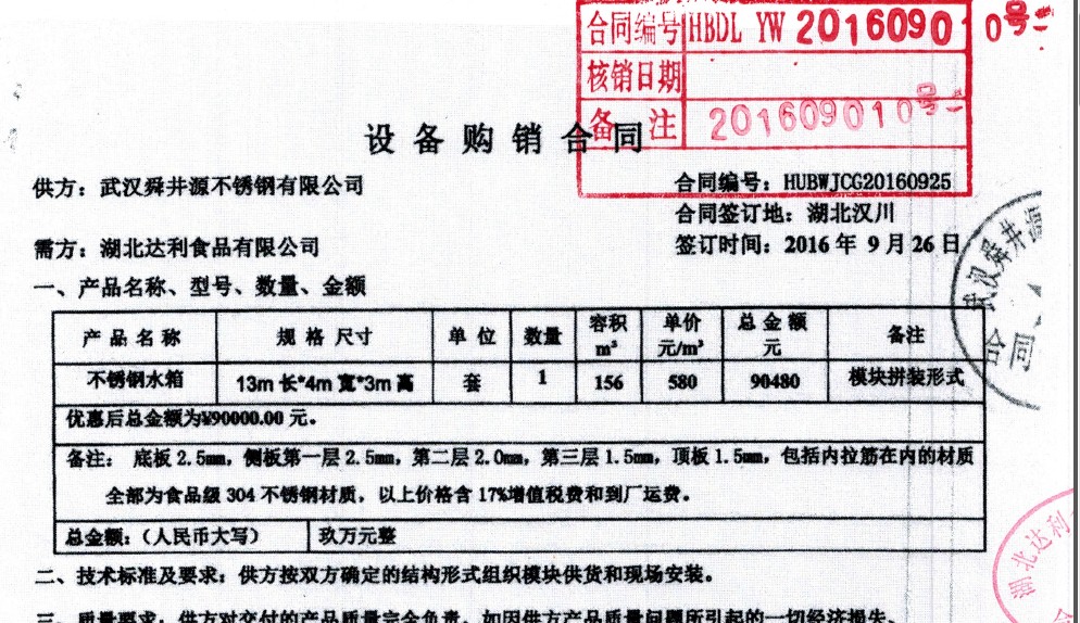 我公司于2016年9月20日受湖北達(dá)利園集團(tuán)采購部邀請(qǐng),于次日來達(dá)利園3號(hào)工廠,幫忙設(shè)計(jì)一臺(tái)156立方米大小的,儲(chǔ)存飲用水的不銹鋼水箱,以便解決達(dá)利園3號(hào)工廠樂虎飲料的線科學(xué)生產(chǎn),我公司業(yè)務(wù)員于次日來達(dá)利園3號(hào)工廠并設(shè)計(jì)出一套規(guī)范的尺寸,于2016年9月26日簽訂設(shè)備購銷合同,簽訂完畢后按約定期限生產(chǎn),并于2016年10月8日安裝完畢。經(jīng)達(dá)利園集團(tuán)領(lǐng)導(dǎo)驗(yàn)收合格后一次性支付工程尾,整個(gè)流程完畢。